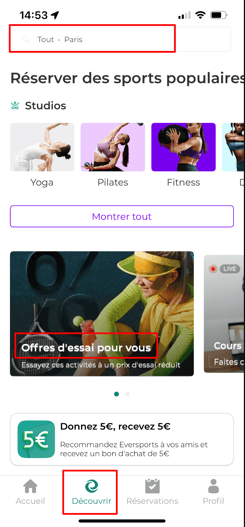 Dans l’onglet Découvrir, vous pouvez rechercher des studios en fonction de leur emplacement et filtrer par activités ou sports spécifiques. Cette section propose également un aperçu des offres d’essai et des cours en ligne, et vous permet d’explorer les lieux sportifs à proximité en cliquant sur la carte. Les nouveaux studios sur Eversports y sont également mis en avant. N’hésitez pas à tester quelque chose de nouveau – vous pourriez découvrir votre futur studio ou activité préféré·e :)