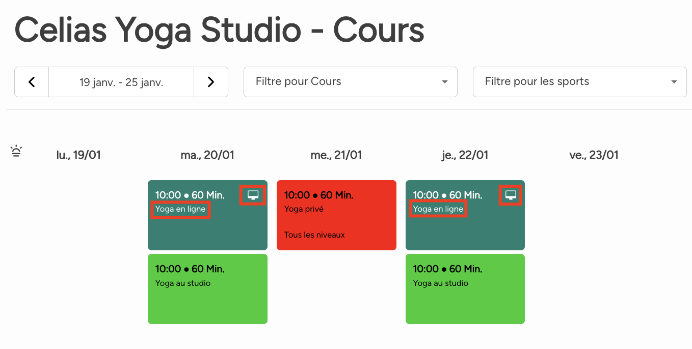 Dans l’horaire du studio, sélectionnez un cours portant la mention « En ligne ». Ces cours sont également reconnaissables grâce à l’icône en forme d’ordinateur affichée sur la carte du cours. Cette icône indique que l’activité se déroule à distance. Une fois le cours identifié, vous pouvez le réserver comme vous le feriez pour un cours en présentiel.