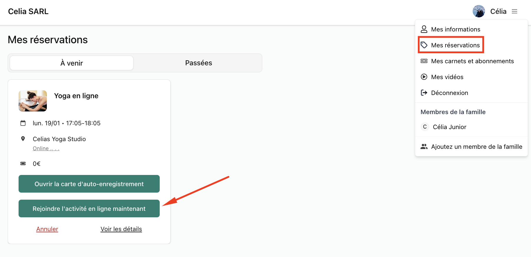 Si vous êtes connecté·e à votre profil, votre réservation à venir pour un cours en ligne est accessible depuis la section « Mes réservations ».