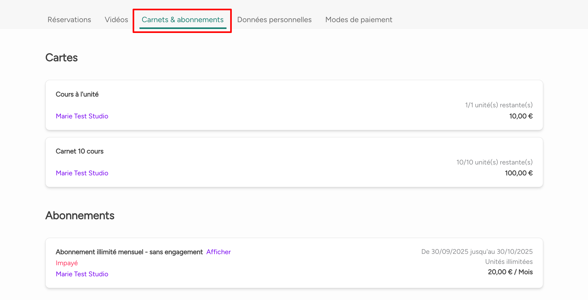 🏦 Si le mode de paiement de votre abonnement est le prélèvement SEPA en ligne automatisé, veuillez contacter directement le studio pour modifier votre IBAN.