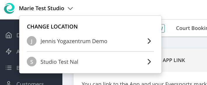 Once set up, switch between locations easily via the top-left menu in the Eversports Manager: