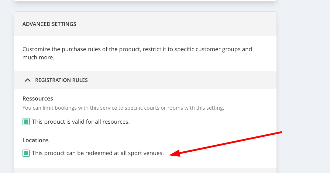 Services: Time- and blockcards can be made available in selected locations. You can decide to make them available in the settings of a product > Advanced settings > Registration Rules > Locations.