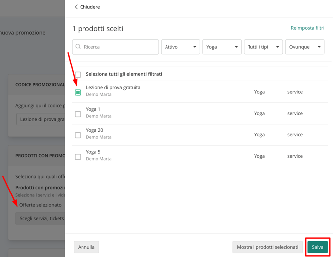 6. Seleziona i tuoi prodotti prova (es. lezioni di prova, carnet prova)