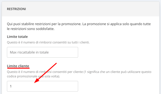 7. Imposta eventuali restrizioni: ad esempio, per le lezioni di prova consigliamo un limite di 1 utilizzo per cliente, così ogni nuovo cliente può provare solo una volta