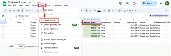 Vai alla scheda Dati, seleziona la colonna “Iscritto dal” e clicca su Filtro.