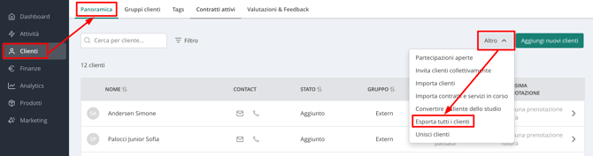 Suggerimento: Puoi applicare dei filtri prima dell’esportazione per restringere l’elenco in base a criteri specifici — ad esempio, i clienti che hanno accettato l’opzione di Comunicazioni di Marketing.