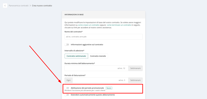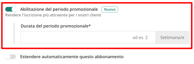 - Estensione automatica: se abilitata, i periodi successivi al periodo promozionale saranno addebitati al prezzo standard.