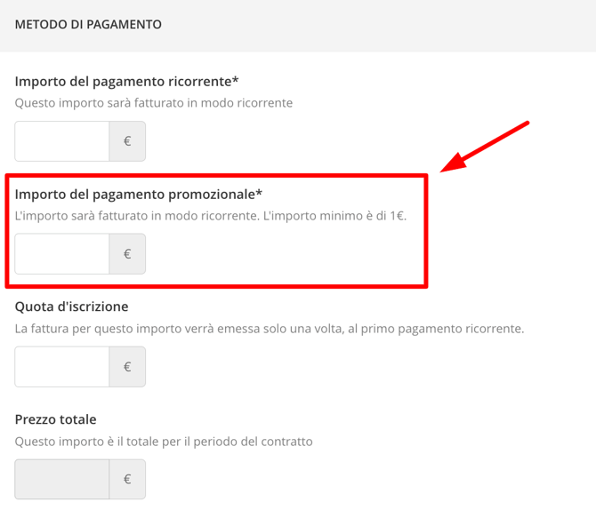 4. Inserisci il prezzo scontato per il periodo promozionale. Il prezzo promozionale può essere impostato tra 1 € e l’importo regolare del pagamento ricorrente.