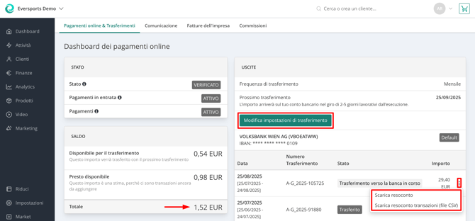 Puoi scaricare il report in qualsiasi momento cliccando sui tre puntini accanto al bonifico corrispondente