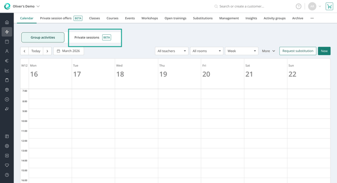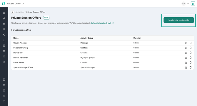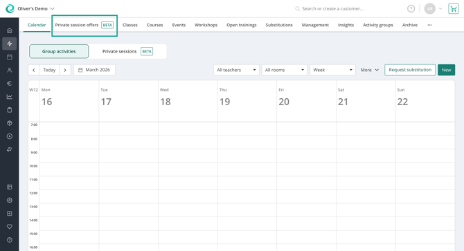 When you navigate to Activities you can find a new tab called "Private session offers". There you can create all the different private sessions that you want to schedule appointments for.
