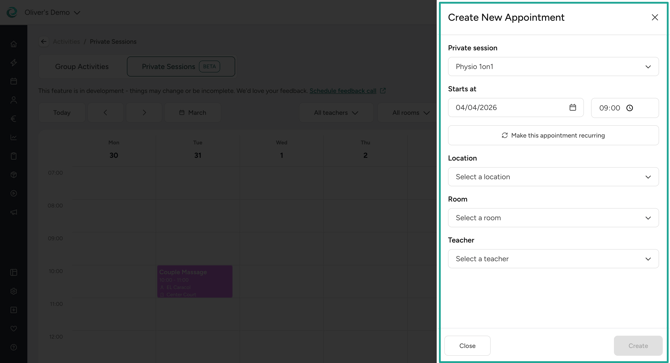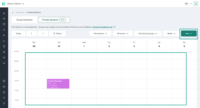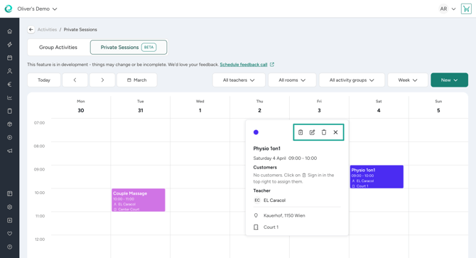 Go to Activities > Calendar and you will find an option to open a new, modern private session calendar. Here you can either click on the desired calendar slot to create a new appointment or use the button on the right top to start the process. Once you have created an appointment, you can edit or cancel it.