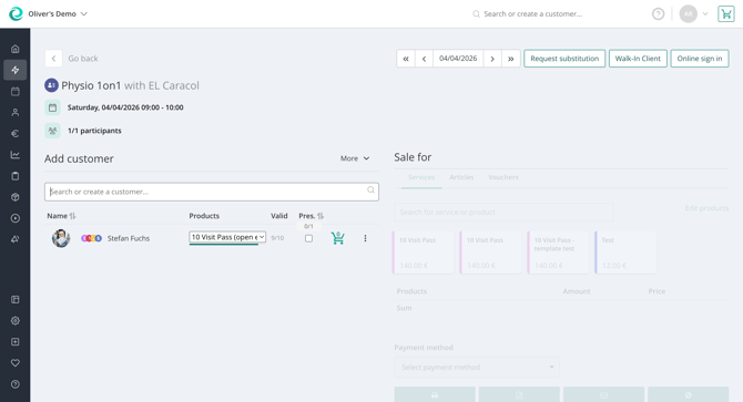 To sign-in a customer, you can find an icon in the appointment modal that brings you to the sign-in. There, you can sign-in customers as you are used to and sell them products like for other activities.