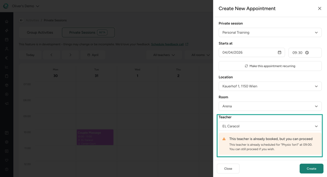 In general, you are made aware of resource conflicts, but you can still decide to schedule the appointment(s) with the resources assigned. - Access for admin and leading employee roles only - currently only admins and leading employees can access the private session schedule and manage appointments there. This will change soon so that also other roles will be able to access it.