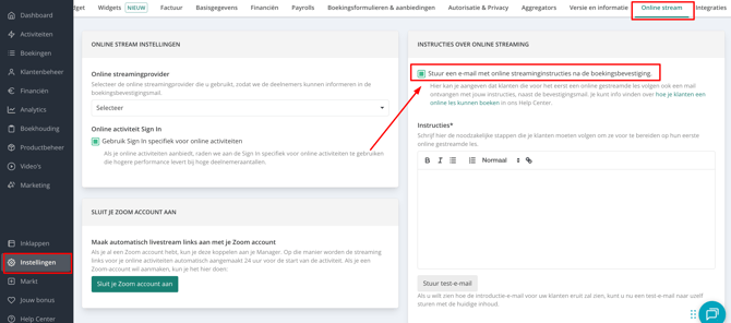 - Online activiteit-instructies: Ga naar Instellingen > Online Stream en schakel in dat deelnemers die voor de eerste keer meedoen, per e-mail instructies voor de setup ontvangen.