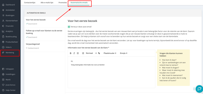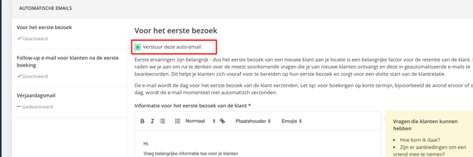 Tip: Als je proeflessen of gratis lessen aanbiedt, raden we ook aan om deze automatische e-mail te activeren en de tekst aan te passen. Vraag de klant hoe hun eerste les was, of ze nog vragen hebben, welk product ze daarna zouden moeten kopen, welke activiteit je aanbeveelt, enz. Dit is een heel goede manier om klanten na de proefles te stimuleren om een ander product aan te schaffen.