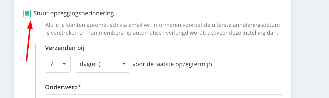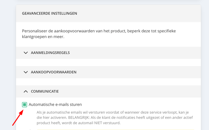 Naast de kern-e-mails kun je automatische herinneringen instellen op basis van producttypes. Je vindt deze in het betreffende instellingen-tabblad van het product: