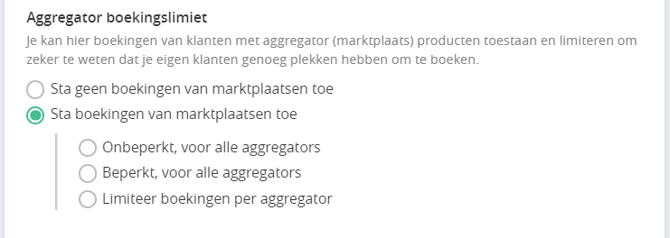 - vind je de optie "Aggregator boekingslimiet". Hier kun je de instelling wijzigen in “Sta boekingen van aggregators toe”.