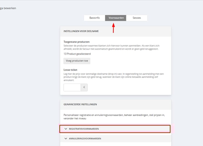 - Ga naar het tabblad Voorwaarden > Geavanceerde instellingen > Registratievoorwaarden