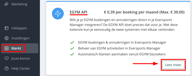 Je kunt de EGYM Wellpass® API extensie activeren in het menu Markt (linksonder).