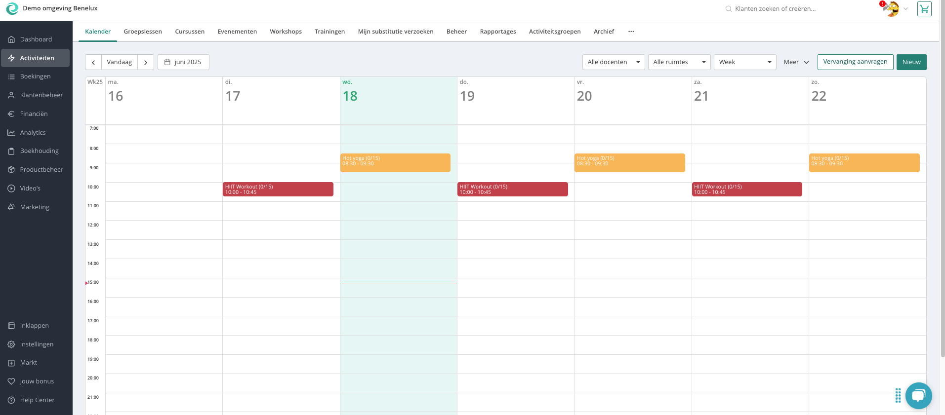 Het eerste menu-item binnen 'Activiteiten' is de kalender. Hier zie je een overzicht van alle activiteiten die je aanbiedt zoals groepslessen, workshops etc.