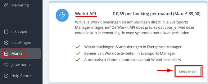 Je kunt de Workit API extensie activeren in het menu Markt (linksonder).