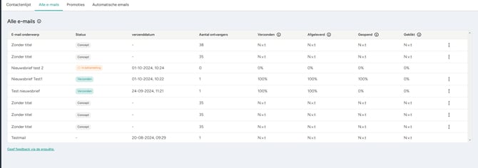 Voor elke e-mail die je verstuurt, kun je in het e-mailoverzicht onder Marketing > Alle e-mails in detail zien hoe deze door je klanten is ontvangen, bijvoorbeeld door het open- en klikpercentage te bekijken. Met de verkregen inzichten kun je leren van je vorige e-mails en je toekomstige communicatie gericht optimaliseren.