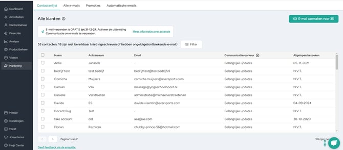 In deze tabel staan je contactpersonen van al je locaties. Je kunt ook belangrijke informatie zien zoals hun e-mailadres, welke communicatie je klanten van je accepteren via Eversports Manager en wanneer hun laatste bezoek was.