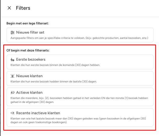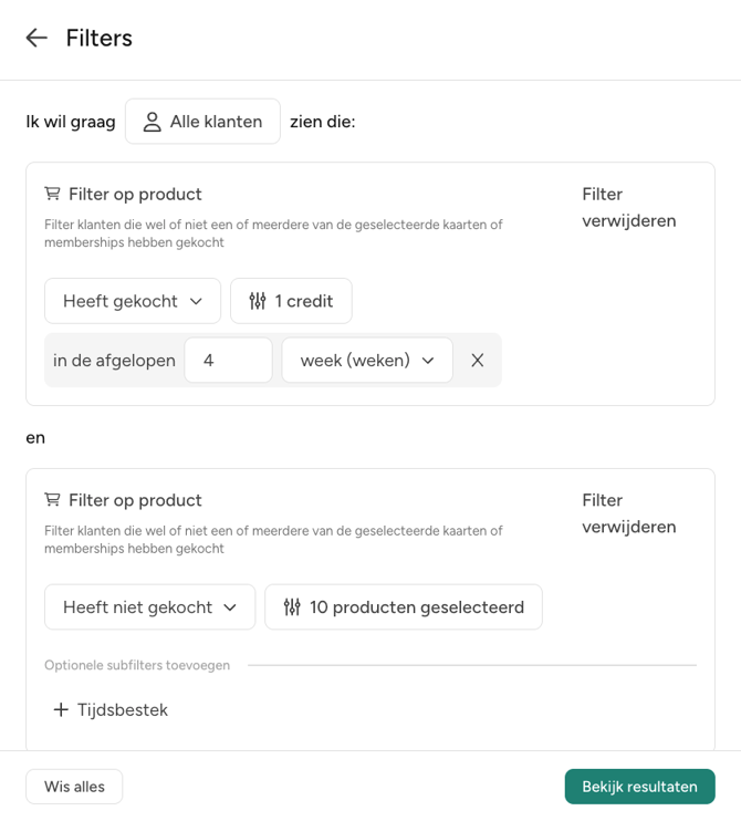 - Verdere filters, bijvoorbeeld productaankoop of activiteitbezoek