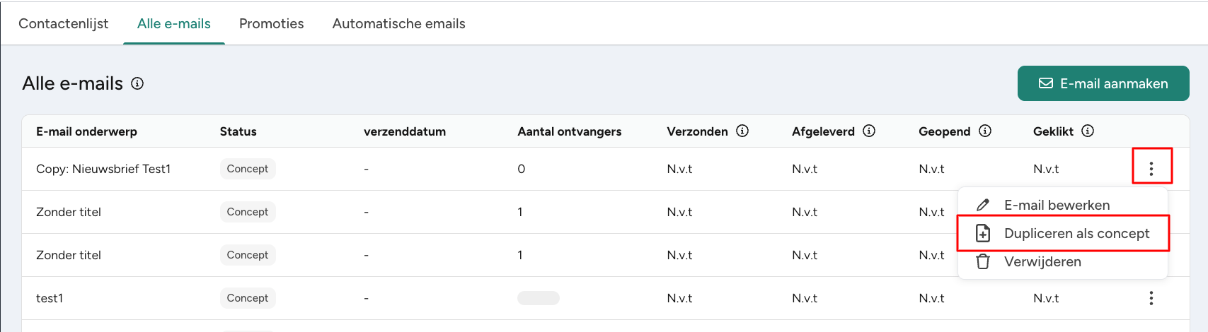 Om een eerdere nieuwsbrief te hergebruiken, ga je naar Alle e-mails, klik je op de drie puntjes aan de rechterkant en selecteer je E-mail dupliceren.