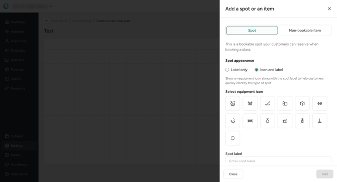 Access the extension settings via the Market and start by creating your first floor plan. Add the number of bookable spots that you can offer to your customers. You can choose specific icons and/or labels for the spots.