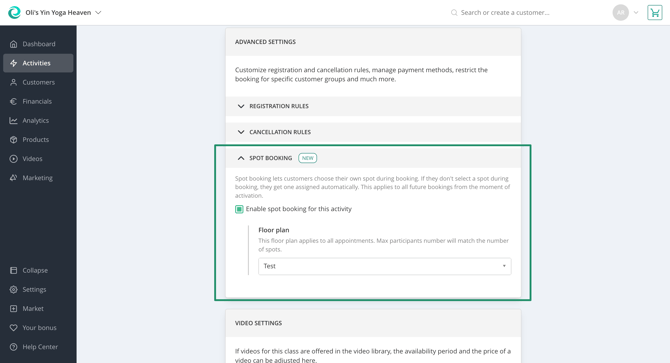 Once you have created your first floor plan, you can edit the activity that you want to enable spot booking for in the Activities section of your Manager. You can find an option to do so in the Rules tab of an activity’s settings. Just enable the spot selection and link the floor plan that you want to use for this activity. Going forward, your customers can choose a spot for all appointments of this activity. In case you already have existing bookings of this activity in the future, spots will be assigned randomly.