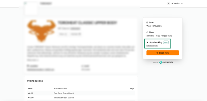 Spot Booking is an optional extension in the Eversports Manager that lets your customers select a specific spot in your in a class or training. It is especially helpful for formats like cycling, reformer Pilates, pole dance, boxing, or HIIT, where customers have a stronger preference towards participating on a specific spot.
