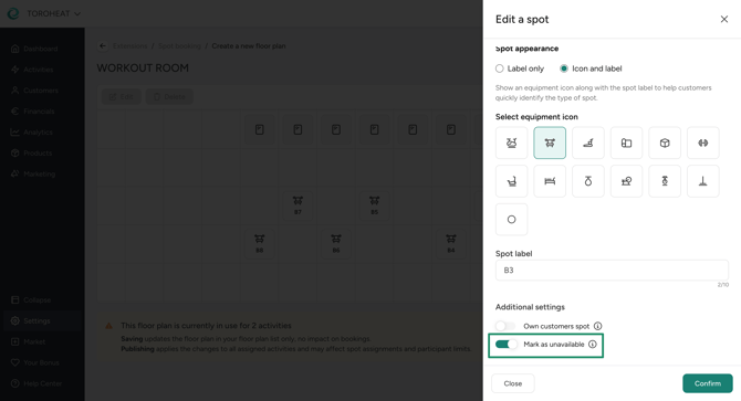 - You can temporarily disable spots: In case something breaks down you can temporarily disable a spot via the floor plan. This will remove the spot from future bookings and reduce the max. participant limit by 1. Once you enable it again, the participant limit is updated and future bookings without spot assigned to the available spot again.