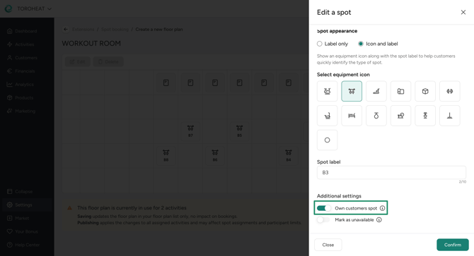 - Add non-bookable items such as trainer, mirror, etc. to the floor plan: This helps customers orient themselves in the room and find their preferred spot.