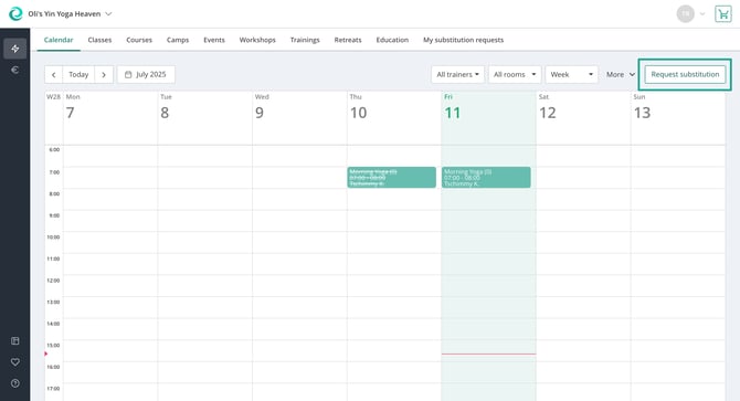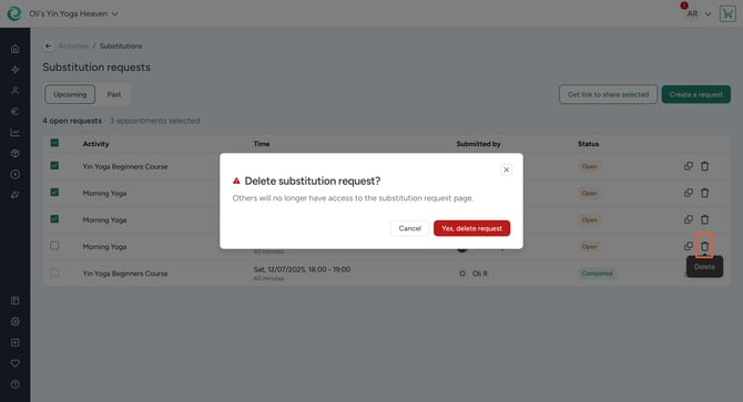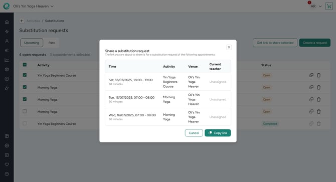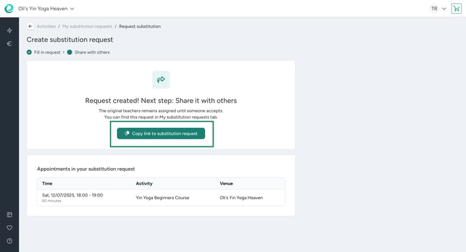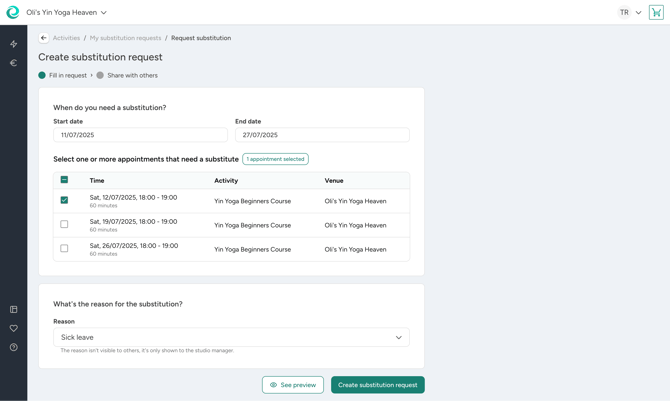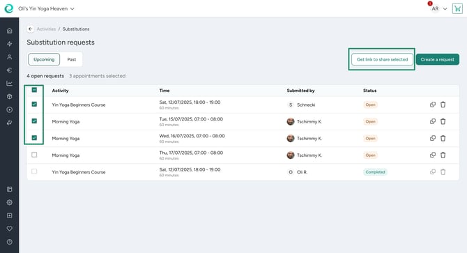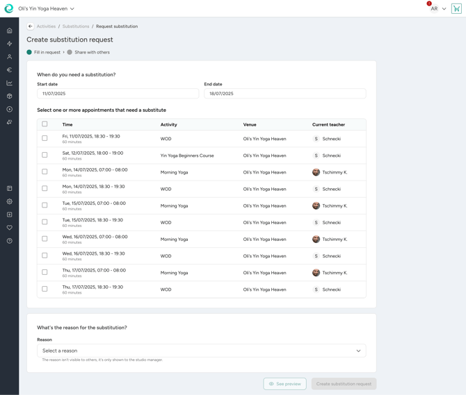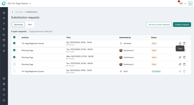 In the activity section, click “Request Substitution.” You then just select the appointments a substitute is needed for, provide a substitution reason and create the request. Through a click on the button the info can be copied easily.